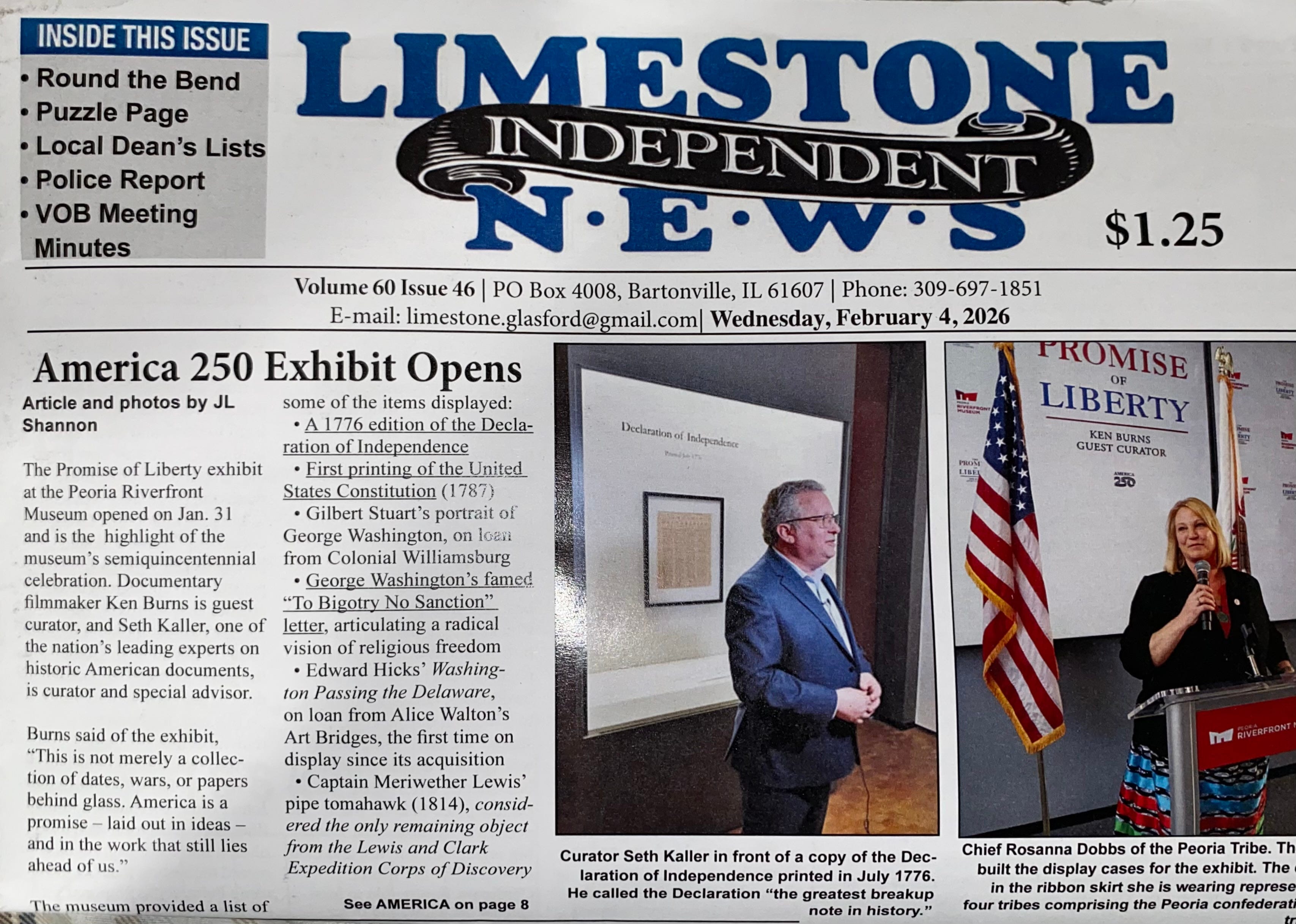 For as long as I can remember, my father has maintained a subscription to the small town newspaper from his home of Bartonville, Illinois, Limestone Independent News. The February 4, 2026 issue featured a cover story about the recent opening of a museum exhibit regarding the semiquincentennial that our country will be celebrating this year, culminating with White House Fourth of July festivities including a wrestling match President Trump seems dead-set on arranging with UFC (Ultimate Fighting Championship).