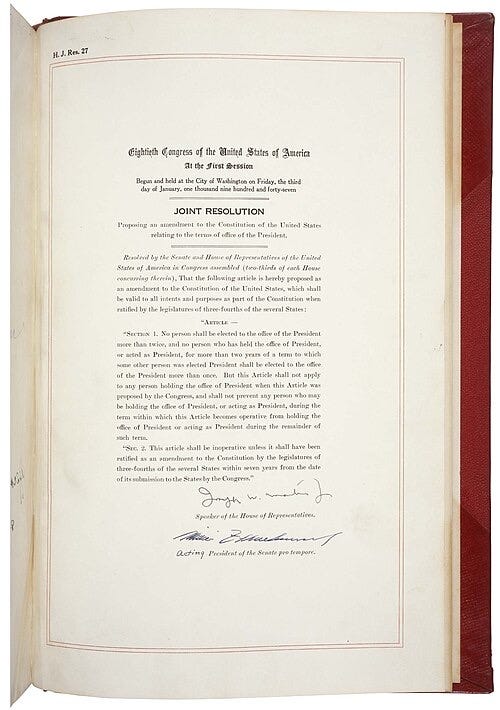Term limitations upon the Executive branch were enacted by Constitutional Amendment in 1951 after being introduced in 1947 for state ratification. The Republicans were elected to the majority in the 80th Congress and rapidly began to implement an agenda intended to roll back the perceived excesses of the Democratic Party. One particularly potent item related to President Franklin Roosevelt’s death after just 82 days into his final term, meaning that Americans elected the man for an unprecedented fourth term and ended up with a middling machine politician and haberdasher, Harry Truman, as their unelected president. Between complaints about corruption, the initial onset of the McCarthy era, the Chinese Revolution, and the Korean War, the GOP easily shepherded the 22nd Amendment into law.